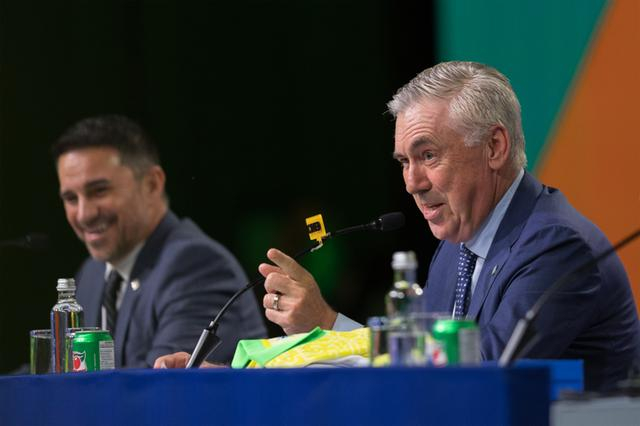 巴西队主教练安切洛蒂(右)在新闻发布会上。