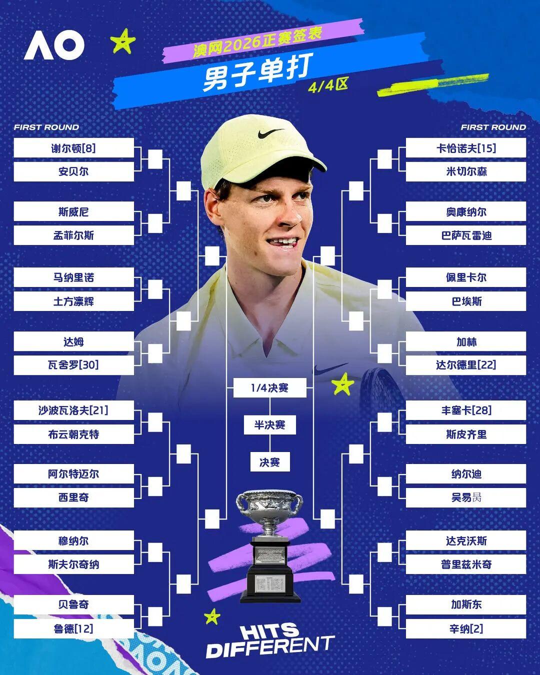 力争澳网三连冠的辛纳在第三轮预计碰上巴西小将丰塞卡,这将是他碰到的第一位种子选手。